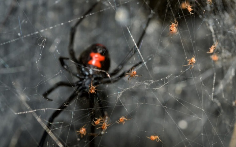 La araña viuda negra (género Latrodectus), como la que mordió a la actriz Cynthia Klitbo, tiene un cuerpo negro y brillante con una forma de reloj de arena rojo en la zona ventral.