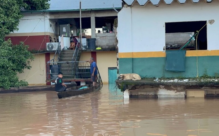 El agua ha cubierto los techos de las viviendas en Hidalgotitlán, Veracruz. Mientras algunos animales se refugian entre láminas, otros lo hacen cruzando la corriente de agua. Esto es parte de la ...