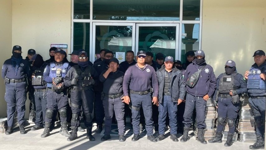 Más de 20 elementos del área de seguridad pública del municipio de Tepanco de López, se manifiestan afuera del palacio municipal, exigiendo mejoras salariales, equipamiento, uniformes y recursos ...